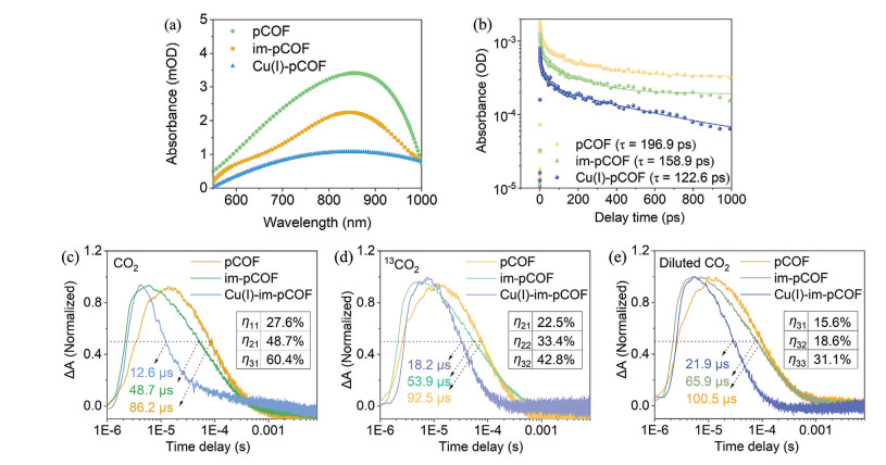 Figure 14 (a) fs-TAS spectra and (b) fs-TAS kinetic plots at 900 nm of pCOF, im-pCOF, and Cu(Ⅰ)-im-pCOF; μs-TAS spectra of pCOF, im-pCOF, and Cu(Ⅰ)-im-pCOF under different CO2 environments of (c) H2O bubbled with 12CO2, (d) H2O bubbled with 13CO2, and (e) H2O bubbled with 10%CO2/90%N2[116]