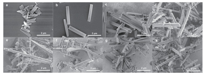 Figure 16 SEM images of the intimal Tph+TBA (a), DhaTph Tubes prepared with different reaction times of 0 h (b), 0.5 h (c), 2 h (d), 5 h (e), 15 h (f), 35 h (g), and 72 h (h)[117]