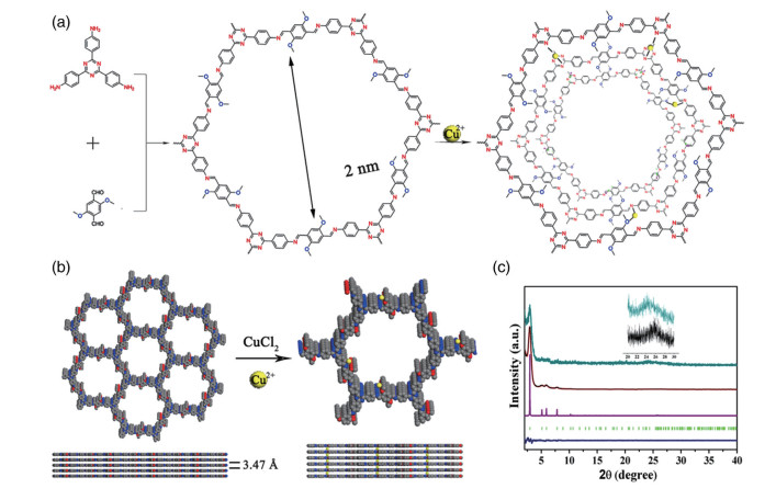 Figure 17. (a) Synthetic scheme of DHTA-TTA 2D COF and Cu-COF; (b) Structural models of DHTA-TTA 2D COF and Cu-COF (Grey, blue, red, and yellow spheres represent C, N, O, and Cu atoms, respectively; H atoms are omitted for clarity); (c) PXRD patterns of DHTA-TTA 2D COF[118]Reaction conditions: 1,2-dichlorobenzene, 1-butanol, 120 ℃, 36 h, CuCl2; In c: comparison between the experimental (black) and Pawley refined (red) profiles, the simulated pattern for AA stacking mode (purple), the refinement differences (blue), and experimental PXRD patterns for Cu-COF (dark cyan).