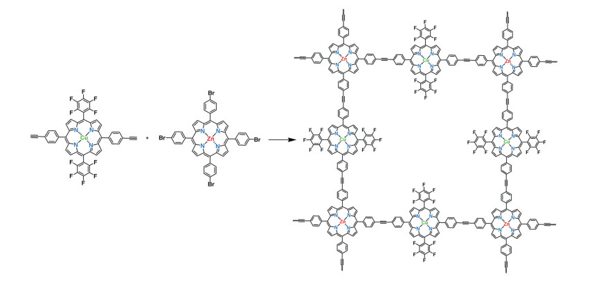 Figure 18. Synthetic scheme of ZnCu-COF[119]Reaction conditions: triethylamine, tetrahydrofuran, triphenylphosphine, Pd(Ⅱ) acetate, cuprous iodide, 130 ℃, 120 h.