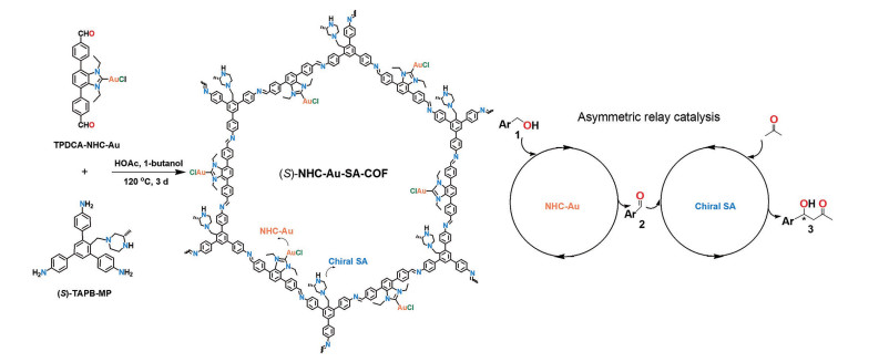 Figure 2 Synthesis process and asymmetric catalytic application of (S)-NHC-Au-SA-COF[102]