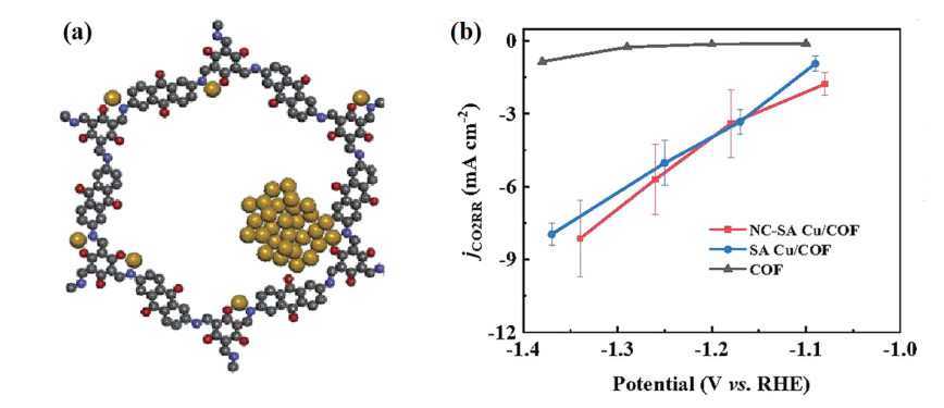 Figure 5 (a) A Structural model of NC‐SA Cu/COF (Grey, blue, red, and brown spheres represent C, N, O, and Cu atoms, respectively, and H atoms are omitted for clarity); (b) CO2 reduction current densities on NC-SA Cu/COF, SA Cu/COF, and pure COF[110]