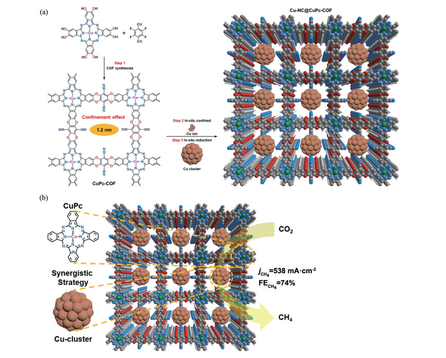 CH4 is a crucial strategic energy source. It is cleaner than coal and oil and plays an indispensable role in the current energy system. However, the electroreduction of CO2 to methane is a complex process. This process faces two major challenges: the need to activate water molecules to provide protons and competition with the strong hydrogen evolution side reaction. Researchers have successfully created a unique microenvironment by integrating Cu into a COF. This environment efficiently activates both CO2 and water, and stabilizes reaction intermediates, thereby effectively guiding the reaction towards methane production while suppressing hydrogen generation.