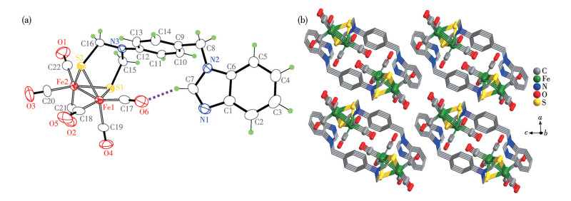 Compound 1 crystallizes in the triclinic space group P1 (Table 1). As shown in Fig.1a, the crystal structure of 1 is centered around two Fe(Ⅰ) ions, linked by a functionalized N-heteropropyl disulfide bridge and coordinated with six terminal carbonyl ligands. Two sulfur atoms are connected by the N-heteropropyl bridge, forming a chair-shaped six-membered ring and a boat-shaped six-membered ring, with the bridgehead nitrogen atom oriented towards the Fe1 atoms. The S1⋯S2 and Fe1—Fe2 distances are 0.305 1(1) and 0.250 3(9) nm, respectively. The Fe—S bonds range from 0.225 4(1) to 0.226 6(1) nm, and the Fe—C bonds vary from 0.176 9(5) to 0.180 2(5) nm, which are comparable to those in the previous report[17-19]. The dihedral angle between the planes S2—Fe1—Fe2 and S1—Fe1—Fe2 is 71.918(41)°. Additionally, the benzene ring and the benzimidazole ring are not coplanar, with a dihedral angle of 87.57(59)°. Detailed structural analysis also revealed that there exists an intramolecular C—H⋯O (H7⋯O6 0.25 nm, ∠C7—H7⋯O6 154°) hydrogen bond. The compounds are neatly stacked along the crystallographic b-axis, as shown in Fig.1b, but no π⋯π interaction is observed.