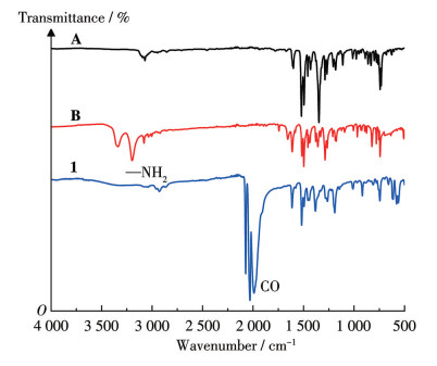 Compound 1, A, and B were also characterized by FTIR spectroscopy (Fig.2). Absorption peaks at 3 339 and 3 195 cm-1 of B can be attributed to the stretching vibrations of the —NH2 group. The IR spectra of compound 1 presented characteristic CO stretching vibration bands at 2 071, 2 030, and 1 989 cm-1.