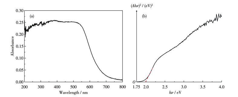 UV-Vis spectroscopy of compound 1 exhibited characteristic absorptions at ca. 490 nm in the solid state, consistent with the spectral features of other reports (Fig.3a)[20-22]. The Tauc plot was also determined by calculations (Fig.3b). The band-gap energy (Eg) was estimated from the x-axis intercept at (Ahν)2=0. The Eg of compound 1 was 1.98 eV. The strong UV-Vis absorption and relatively low Eg encouraged us to explore its photocatalytic reaction.