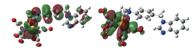 DFT calculations for compound 1 were performed using Gaussian 03W at the B3LYP level. The HOMO (highest occupied molecular orbital) and LUMO (lowest unoccupied molecular orbital) energy levels, along with their difference, are presented in Fig.5 and Table 4. The LUMOs are primarily distributed on the [FeFe]-hydrogenase unit, rather than on the benzene and benzimidazole rings. Compared to the LOMOs, the HOMOs are more spread out and could be distributed on the benzimidazole rings. The HOMO and LUMO energy levels are -0.216 53 and -0.086 36 eV, respectively, with an energy gap of 0.130 47 eV. The narrow energy gap helps with the utilization of sunlight, increases the possibility of chemical reactions participating, and thereby boosts H2 production efficiency.