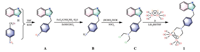 Under N2 atmosphere, [Fe2(μ-S)2(CO)6][16] (D, 500 mg, 1.45 mmol) and anhydrous THF (20 mL) were added to a Schlenk flask. Triethylborohydride (2.9 mL, 2.9 mmol) was added dropwise to the reaction system at -78 ℃. The reaction was maintained at -78 ℃ for 1 h, after which C (850 mg, 2.9 mmol) was added. After stirring for an additional hour, the reaction mixture slowly warmed to room temperature. The solvent was then removed, and the resulting red solid was purified by column chromatography (DCM/petroleum ether as eluent, 1∶3, V/V). Compound 1 was isolated as a deep red solid (344 mg, 40.0% yield). 1H NMR (DMSO-d6, 400 MHz): δ 8.35 (s, 1H), 7.72-7.45 (m, 2H), 7.29 (d, J=8.3 Hz, 2H), 7.19 (q, J=6.5, 6.0 Hz, 2H), 6.90 (d, J=8.3 Hz, 2H), 5.40 (s, 2H), 4.54 (s, 4H). Selected FTIR (KBr pellets, cm-1): 2 073 (vs), 2 028 (vs), 1 991 (vs), 1 621 (w), 1 521 (w), 1 443 (w), 1 365 (w), 1 254 (w), 1 521 (w), 1 176 (w), 917 (w), 743 (w).
