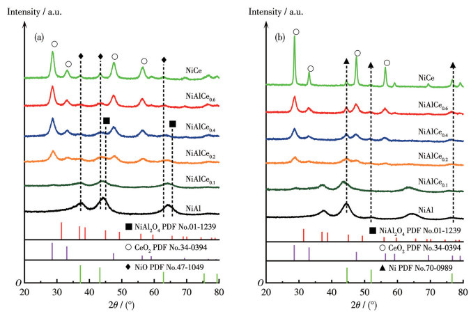 图 1为还原前后催化剂的XRD图。如图 1a所示,对于NiAl,在2θ=37.3°、44.3°和64.3°处出现了3个较宽的衍射峰。因为NiO(PDF No.47-1049)和NiAl2O4(PDF No.01-1239)在这几处的衍射峰位置接近,所以这些峰是NiO和NiAl2O4的信号叠加。随着Ce的引入,在2θ=28.5°、33.1°、47.5°和56.6°处出现了CeO2的特征衍射峰(PDF No.34-0394),分别对应为立方相CeO2的(111)、(200)、(220)和(311)晶面。随着Ce含量的增加,CeO2的衍射峰强度增加,峰形变窄。同时,NiO和NiAl2O4的衍射峰强度逐渐减弱,在NiAlCe0.4上已经看不到NiAl2O4的衍射峰。这表明CeO2的引入抑制了NiO的晶化团聚,促进了其分散。NiAl2O4物相的快速消失与2个因素有关,一是Ce取代Al后,Al含量减少,形成的NiAl2O4减少;另一方面是Ce削弱了NiO与Al2O3的作用,抑制了NiAl2O4的形成[23]。如图 1b所示,还原后催化剂在2θ=44.6°、51.9°、76.5°出现金属Ni的特征衍射峰(PDF No.70-0989)。在NiAl和NiAlCe0.2上仍然观察到NiO和NiAl2O4的衍射峰,说明NiO和NiAl2O4尖晶石并没有完全被还原。当x > 0.2时,NiO的衍射峰消失,NiO被完全还原。该结果表明Ce的加入可以促进NiO的还原。所有的催化剂在还原前后都没有出现Al2O3的衍射峰,说明Al2O3以无定型的形式存在。