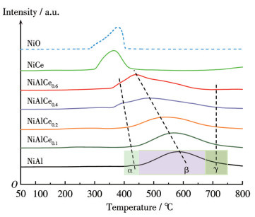 催化剂的H2-TPR曲线如图 2所示。NiCe催化剂的还原反应出现在300~400 ℃,还原峰温度约为365 ℃,与单一组分NiO的还原峰温度很接近。这表明在NiCe催化剂中,NiO与CeO2之间的作用弱,NiO组分几乎相当于“独立的NiO”[25]。在温度高于750 ℃时,NiCe样品的还原曲线有上扬的趋势,这是因为CeO2开始被还原[20]。对于NiAl催化剂,还原带出现在400~750 ℃,还原峰温度远高于单一组分的NiO,这是NiO与Al2O3之间存在相互作用导致的[26-27]。NiAl催化剂的还原带大致可以分为3段。第1段出现在400~450 ℃之间,记为α,这部分的还原归属为与Al2O3作用弱的NiO的还原[28]。由图可见,NiAl催化剂α段的耗氢量很小。第2段位于450~670 ℃,记为β,归属为与Al2O3有强相互作用的NiO的还原,这部分的氢气消耗在整个还原中占比大[26]。第3段为还原温度高于670 ℃的γ段,对应NiAl2O4尖晶石中NiO的还原[27]。随着Ce的引入,α段温度向低温偏移,同时耗氢量逐渐增大。β段的还原温度也显著向低温偏移,耗氢量减小。这表明Ce取代部分Al后削弱了NiO与Al2O3之间的作用,且弱相互作用的NiO占比增加。γ段的耗氢量随着Ce含量的增加而逐渐减小,当x=0.4时,γ段的耗氢量几乎降为零,这进一步验证了Ce的加入抑制了NiAl2O4尖晶石的生成,该结果与XRD的结果相一致。