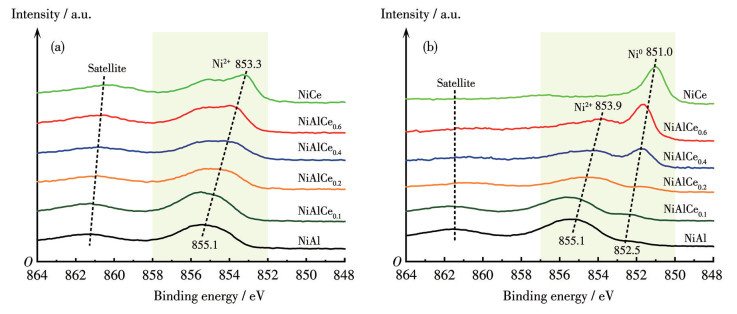 为了研究催化剂的表面组成和元素化学态,对催化剂进行了XPS测试。如图 3a所示,对于还原前的NiAl样品,在855.1和861.2 eV处的光电子能谱峰分别归属于Ni2+2p3/2特征峰和卫星峰。单组分NiO的Ni2+2p3/2光电子能谱峰会出现多重分裂[29-30],而NiAl中Ni2+2p3/2的光电子能谱峰并没有明显的分裂。同时,与单组分NiO的Ni2+2p3/2结合能(853.3~853.9 eV)相比[31-32],NiAl催化剂中Ni2+2p3/2的结合能增加了1.2~1.8 eV。这些结果表明催化剂中NiO与Al2O3之间有强的电子相互作用,Ni2+把电子推向Al3+ [16]。随着Ce的引入,Ni2+2p3/2的光电子能谱峰向低结合能方向偏移,且逐渐出现分裂的特征,这充分证明Ce的引入削弱了Ni与Al之间的相互作用。对NiCe而言,Ni2+2p3/2的光电子能谱峰与典型的单组分NiO基本一致,表明Ni与Ce之间的作用非常弱。图 3b是还原后样品的Ni2p谱图。NiAl催化剂中出现了很弱的Ni0峰,Ni2+的峰仍然很强。这说明NiAl中的NiO没有完全被还原,其原因是Ni与Al的强相互作用导致NiO的还原难度增大[33]。此外,NiAl中形成了NiAl2O4尖晶石,其中的NiO很难被还原[27]。NiAl中引入Ce后,伴随着Ni2+峰强度的下降,Ni0峰强度显著增加,峰位置也随着Ce含量的增加往低结合能方向偏移,而NiCe的NiO峰完全消失。这些结果表明引入Ce削弱了Ni与Al之间的电子相互作用,大大促进了NiO的还原,与XRD和H2-TPR的结果一致。