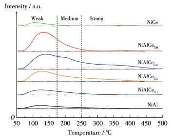 Catalyst Atomic fraction / % y Ni Al Ce NiAl 19.0 (50) 81.0 (50) 0.0 (0) 0.24 (1.0) NiAlCe0.1 40.7 (50) 57.2 (45) 2.1 (5) 0.68 (1.0) NiAlCe0.2 43.7 (50) 47.9 (40) 8.4 (10) 0.78 (1.0) NiAlCe0.4 47.6 (50) 30.7 (30) 21.7 (20) 0.91 (1.0) NiAlCe0.6 51.6 (50) 23.8 (20) 24.5 (30) 1.07 (1.0) NiCe 67.4 (50) 0.0 (0) 32.6 (50) 2.07 (1.0) *The data in parentheses were the nominal values of the catalysts. 2.5 催化剂的表面碱性