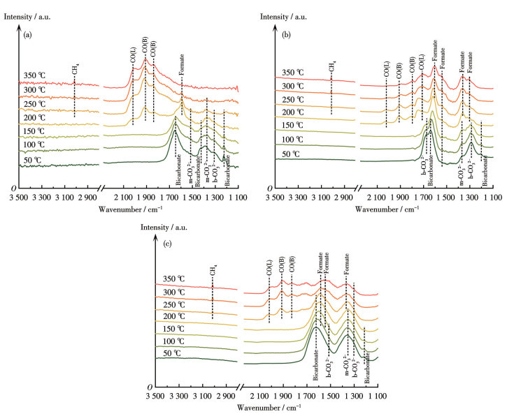 图 6b是NiCe催化剂的原位DRIFTS。在低温时,CO2吸附在催化剂载体上形成碳酸氢盐(1 203、1 639 cm-1)[43, 45]、m-CO32-(1 368 cm-1)和b-CO32-(1 288、1 673 cm-1)[41, 43]。随着反应温度的上升,NiCe催化剂表面的碳酸氢盐和碳酸盐的红外吸收带逐渐减小。在200 ℃时,碳酸氢盐的吸收峰消失,但仍然可以看到碳酸盐的吸收,同时出现了甲酸盐(1 600、1 540、1 361、1 302 cm-1)、CO(L)(2 021、1 712 cm-1)和CO(B)(1 800、1 919 cm-1)的红外吸收峰[40, 48]。在250 ℃时观察到CH4(3 015 cm-1)的红外吸收信号,且其强度随着温度的升高而逐渐增加。CO(L)和CO(B)的红外吸收带强度随着温度的升高逐渐减小至几乎消失,甲酸盐的信号也减小但在350 ℃时仍保持较大的强度。对于Ni基催化剂而言,CO是由甲酸盐分解而来[42, 45]。生成的CO减少表明更多的甲酸盐直接加氢生成CH4。因此,NiCe催化剂上CO2甲烷化途径以甲酸盐路径为主。
