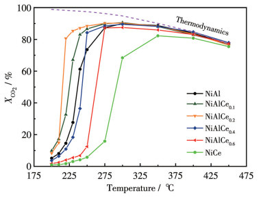 根据XPS计算得到的催化剂的表面金属含量如表 2所示。NiAl表面的Al的浓度远高于计量浓度,而Ni的浓度则低很多。表面Al富集现象是Al基氧化物催化剂的一个特征[19, 34]。随着Ce含量的增加,表面Al的占比减小,而Ni的占比增加,其中NiAlCe0.4中表面Al、Ni的含量及y值已经接近计量值。NiCe表面的Ni的占比高于计量比,呈现“富镍贫铈”的现象。这些结果表明Ce的引入有利于Ni在催化剂表面的分布。