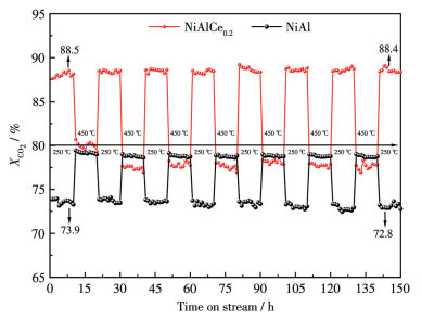 对NiAl和NiAlCe0.2催化剂进行了稳定性测试。为了加速催化剂的失活,在250和450 ℃两个温度下进行循环测试,WHSV为24 000 mL·g-1·h-1,每个温度保持10 h,连续反应150 h,结果如图 8所示。在450 ℃时,CO2转化率很接近,这是因为反应受到热力学控制,转化率达到平衡值(约为77%)。经过150 h的测试后,NiAl催化剂的催化活性略有下降,在250 ℃时CO2转化率从73.9%下降到72.8%。对于NiAlCe0.2催化剂,CO2转化率从初始的88.5%降到测试结束时的88.4%,其催化活性几乎不变。该结果表明,NiAlCe0.2催化剂具有良好的催化稳定性。