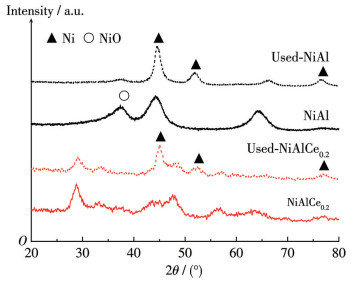 图 9为150 h稳定性测试后NiAl和NiAlCe0.2的XRD图。与新鲜的NiAl催化剂相比,稳定性测试后NiO的特征衍射峰消失,而在2θ=44.6°、51.9°、76.5°处出现Ni的特征衍射峰。与NiAl相比,稳定性测试后NiAlCe0.2的Ni特征峰强度更低,峰宽更大。这表明Ce的引入抑制了金属Ni在反应中的团聚烧结,提升了催化剂在催化反应中的稳定性。