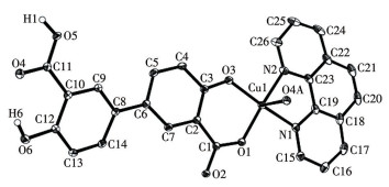 A mixture of CuCl2·2H2O (0.034 g, 0.20 mmol), H4dbda (0.055 g, 0.20 mmol), phen (0.040 g, 0.20 mmol), NaOH (0.016 g, 0.40 mmol), and H2O (10 mL) was stirred at room temperature for 15 min, and then sealed in a 25 mL Teflon-lined stainless steel vessel, and heated at 160 ℃ for 3 d, followed by cooling to room temperature at a rate of 10 ℃·h-1. Green needle-shaped crystals of 1 were isolated manually and washed with distilled water. Yield: 47% (based on H4dbda). Anal. Calcd. for C26H18CuN2O7(%): C 58.48, H 3.40, N 5.25; Found(%): C 58.26, H 3.42, N 5.28. IR (KBr, cm-1): 3 429m, 3 060w, 1 613s, 1 559m, 1 517w, 1 459s, 1 428w, 1 406w, 1 344w, 1 309w, 1 240w, 1 144w, 1 106w, 1 048w, 932w, 886w, 847w, 774w, 721m, 698w, 636w, 594w.