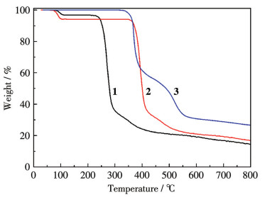 To determine the thermal stability of complexes 1-3, their thermal behaviors were investigated under a nitrogen atmosphere by TGA. As shown in Fig.10, complex 1 lost its two lattice water molecules in a range of 79-107 ℃ (Obsd. 3.2%, Calcd. 3.4%), followed by the decomposition at 208 ℃. For complex 2, there was a release of two H2O ligands between 69 and 108 ℃ (Obsd. 5.9%, Calcd. 6.0%), whereas a dehydrated sample remained stable up to 351 ℃. Complex 3 does not contain any coordinated or crystallization water, and its framework shows stability on heating until 324 ℃.