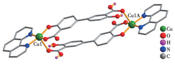 The structure of complex 1 reveals a dimeric complex that contains one Cu(Ⅱ) ion, one μ-H2dbda2- linker, one phen ligand, and one lattice water molecule in the asymmetric unit (Fig.1). The five-coordinated Cu1 center displays a distorted {CuN2O3} quadrangular pyramidal environment that is constructed from three oxygen atoms of two μ-H2dbda2- linkers and a pair of N atoms of the second ligand phen. The distances of Cu—N [0.200 2(18)-0.200 9(2) nm] and Cu—O [0.188 5(2)-0.244 4(2) nm] bonds agree with typical literature data[26,32]. Two H2dbda2- ligands act as μ-H2dbda2- linkers via monodentate carboxylate groups (Scheme 1, mode Ⅰ), which assemble two Cu1 centers to give a cyclic Cu2 complex with a Cu…Cu separation of 1.229 6(4) nm (Fig.2). Such Cu2 molecular units are involved in an intermolecular H-bonding forming a 2D network (Fig.3).