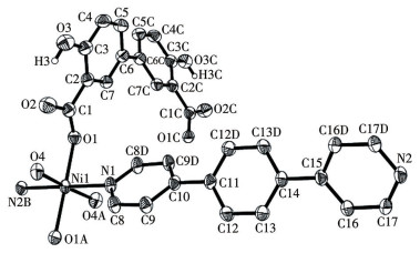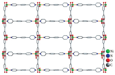 A mixture of NiCl2·6H2O (0.048 g, 0.20 mmol), H4dbda (0.055 g, 0.20 mmol), bpb (0.046 g, 0.20 mmol), NaOH (0.016 g, 0.40 mmol), and H2O (10 mL) was stirred at room temperature for 15 min, then sealed in a 25 mL Teflon-lined stainless steel vessel, and heated at 160 ℃ for 3 d, followed by cooling to room temperature at a rate of 10 ℃·h-1. Green block-shaped crystals of 2 were isolated manually, washed with distilled water, and dried. Yield: 43% (based on H4dbda). Anal. Calcd. for C30H24NiN2O8(%): C, 60.13; H, 4.04; N, 4.68. Found(%): C, 60.43; H, 4.02; N, 4.71. IR (KBr, cm-1): 3 433w, 3 105w, 1 620m, 1 562s, 1 474m, 1 400s, 1 355w, 1 284w, 1 246w, 1 155w, 1 068w, 948w, 877m, 823m, 728w, 690w, 644w, 558w.