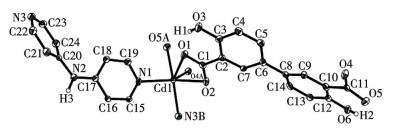 A mixture of CdCl2·H2O (0.040 g, 0.2 mmol), H4dbda (0.055 g g, 0.20 mmol), bpa (0.034 g, 0.2 mmol), NaOH (0.016 g, 0.4 mmol), and H2O (10 mL) was stirred at room temperature for 15 min, and then sealed in a 25 mL Teflon-lined stainless steel vessel, and heated at 160 ℃ for 3 d, followed by cooling to room temperature at a rate of 10 ℃·h-1. Colourless block-shaped crystals of 3 were isolated manually and washed with distilled water. Yield: 45% (based on H4dbda). Anal. Calcd. for C24H17CdN3O6(%): C 51.86, H 3.08, N 7.56; Found(%): C 52.17, H 3.10, N 7.53. IR (KBr, cm-1): 1 628m, 1 594s, 1 556m, 1 513m, 1 471m, 1 421s, 1 333w, 1 286w, 1 248w, 1 210m, 1 159w, 1 098w, 1 059w, 1 017m, 957w, 902w, 871w, 816m, 728w, 690m, 644w, 590w, 559m.