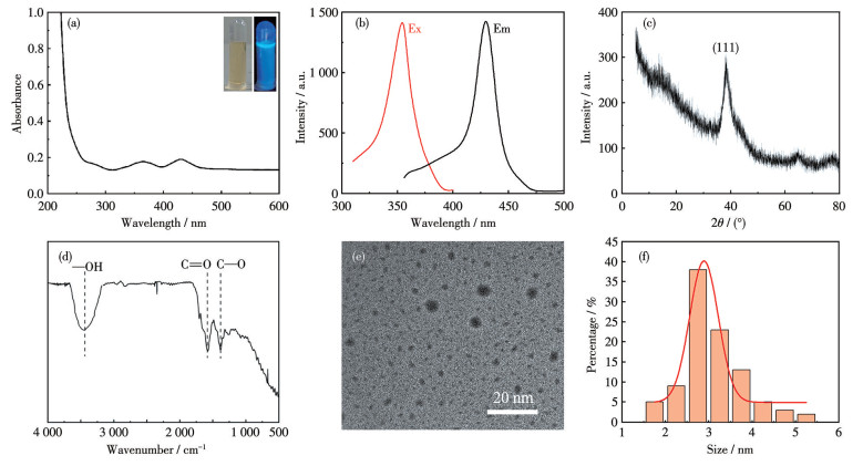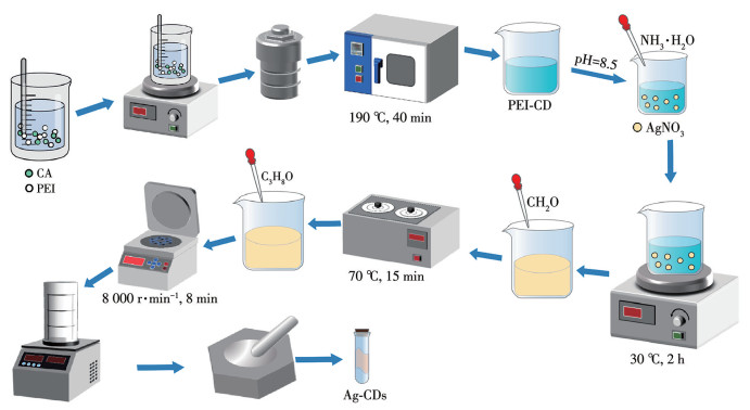 0.6 g of PEI, 2.0 g of CA, and 100 mL of deionised water were combined to prepare a mixture, which was followed by stirring. Once the solution was completely dissolved, it was transferred into a high-pressure autoclave, and the autoclave was placed in an oven at 190 ℃ for 40 min, after being naturally cooled to room temperature (RT), a transparent yellowish liquid was retrieved as the PEI-CD solution (when the liquid PEI-CD was centrifuged and dried, it was converted into solid PEI-CD). The pH of the PEI-CD solution (with a mass concentration of 0.026 g·mL-1) was adjusted to 8.5 using aqueous ammonia (NH3·H2O). Subsequently, 0.1 g of AgNO3 was added to 60 mL of the pH=8.5 PEI-CD solution, and the mixture was stirred at RT for 2 h, followed by the introduction of 100 μL of CH2O. The mixture was heated in a 70 ℃ water bath for 15 min. Following this, 10 mL of C3H8O was added to initiate precipitation, and the mixture was centrifuged at 8 000 r·min-1 for 8 min. After the supernatant was removed, the bottom precipitate was dried and ground into a solid powder, and Ag-CDs were obtained.