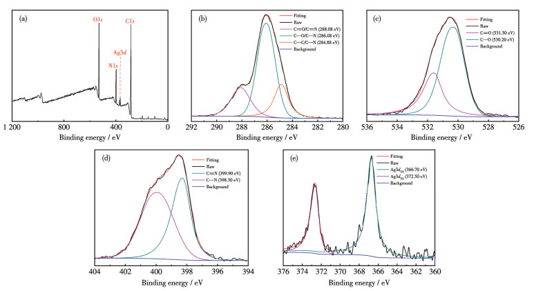 As depicted in Fig. 3, the XPS survey spectrum (Fig. 3a) confirmed the presence of four elements (C, N, O, and Ag) in the sample. Analysis of the high-resolution C1s spectrum (Fig. 3b) revealed multiple distinct peaks at 284.88, 286.08, and 288.08 eV, which are attributable to the C—C/C—N, C—O/C—N, and C=O/C=N bonding configurations in the Ag-CDs, respectively. Analysis of Fig. 3c revealed that the high-resolution O1s spectra exhibited two distinct peaks at 531.50 and 530.20 eV, corresponding to the C=O and C—O functional groups in the Ag-CDs[41]. Analysis of the N1s high-resolution spectra (Fig. 3d) identified two distinct peaks at 398.30 and 399.90 eV, attributable to C—N and C=N bonding configurations, respectively[42]. Meanwhile, deconvolution of the Ag3d high-resolution spectrum (Fig. 3e) confirmed the presence of two characteristic peaks at 366.70 and 372.50 eV, corresponding to the binding energies of Ag0 [43].