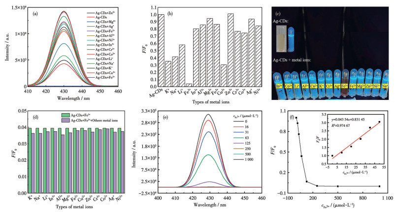 Fe3+ solutions with concentrations ranging from 0 to 1 000 μmol·L-1 were introduced into the Ag-CDs dispersion. A fluorescence spectrophotometer set at an emission wavelength of 429 nm monitored fluorescence variations induced by the interaction of Fe3+ and Ag-CDs. Fig. 4e demonstrates that the emission intensity of the Ag-CDs+Fe3+ mixture declined with increasing Fe3+ concentration, establishing a negative correlation between Fe3+ concentration and Ag-CDs fluorescence. This enables quantitative detection of Fe3+. Fig. 4f further investigates the linear dependency of F/F0 on Fe3+ concentration.