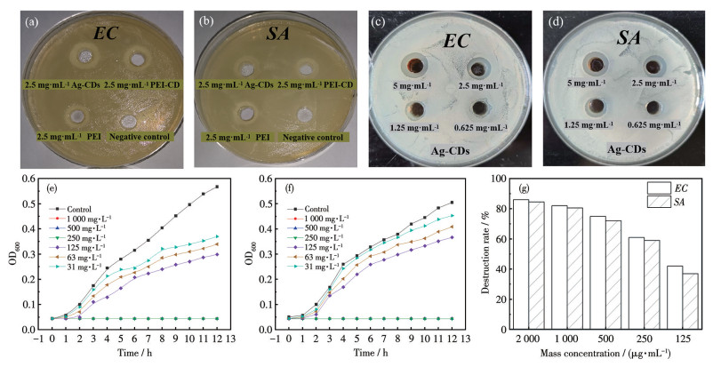 This study utilized the crystal violet staining assay to assess the capacity of Ag-CDs to inhibit bacterial biofilm formation. As shown in the experimental results presented in Fig. 5g, upon increasing the Ag-CDs mass concentration to 2 000 μg·mL-1, the biofilm disruption rates for EC and SA reached 85.92% and 84.5%, respectively. The results further reveal that the inhibitory ability of Ag-CDs was positively correlated with the concentration, with the inhibitory effect on biofilm becoming more pronounced as the concentration gradually increased. This suggests that at such a high mass concentration, the formation and development of both EC and SA biofilms are significantly impeded. In overall comparison, Ag-CDs demonstrate a superior destruction effect on EC biofilm.