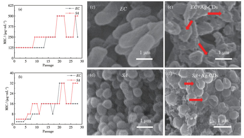 To examine the bacterial morphology post-Ag-CDs treatment, 1 000 μg·mL-1 Ag-CDs were incubated with the bacteria, and compared against Fig. 6c-6f, it could be seen that the bacteria without Ag-CDs treatment had clear outlines and smooth surfaces (Fig. 6c and 6d). After the Ag-CDs treatment, holes appeared in specific places of the cell membrane (as indicated by red arrows in Fig. 6e and 6f), and many bacteria were severely damaged, with shrivelled and ruptured cell membranes and disorganized morphology, and the original appearance of the bacteria was completely lost from all angles. All indications are that Ag-CDs kill bacteria by destroying cell membranes.