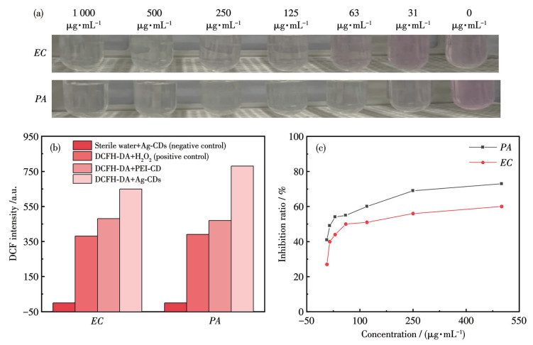 Figure 7. (a) Bacterial TTC dehydrogenase activity after treatment of EC and PA with different mass concentrations of Ag-CDs for 2 h; (b) Intracellular ROS assay after incubation of Ag-CDs with EC and PA; (c) Inhibition rate of Ag-CDs with different mass concentrations on the total SOD enzyme activity of EC and PA2.4.2 Bacterial intracellular ROS detection