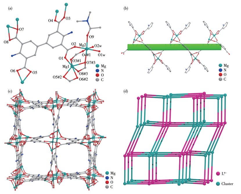 Figure 1  (a) Coordination environments of Mg2+ ions and ligand L4- in Mg-MOF; (b) Helical chain structure in Mg-MOF; (c) 3D structure of Mg-MOF viewed along the c-axis; (d) Topology structure of Mg-MOF