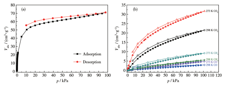 Figure 2  (a) Adsorption-desorption isotherm of Mg-MOF for CO2 at 195 K; (b) Adsorption-desorption isotherms of Mg-MOF for CO2, CH4, and CO at 273 and 298 K