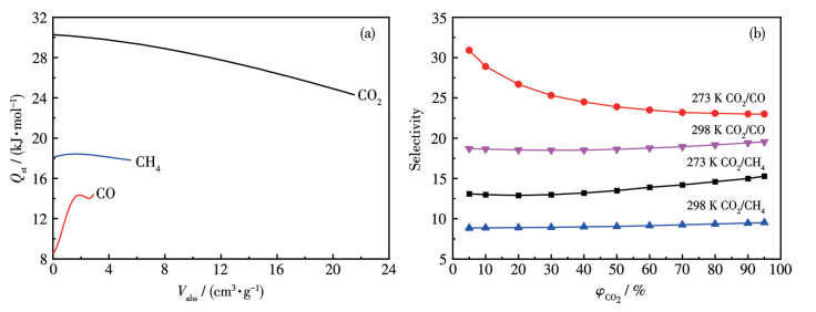 Figure 3  (a) Fitting curves of adsorption heat of Mg-MOF; (b) IAST adsorption selectivity for CO2/CO and CO2/CH4 binary mixtures of Mg-MOF