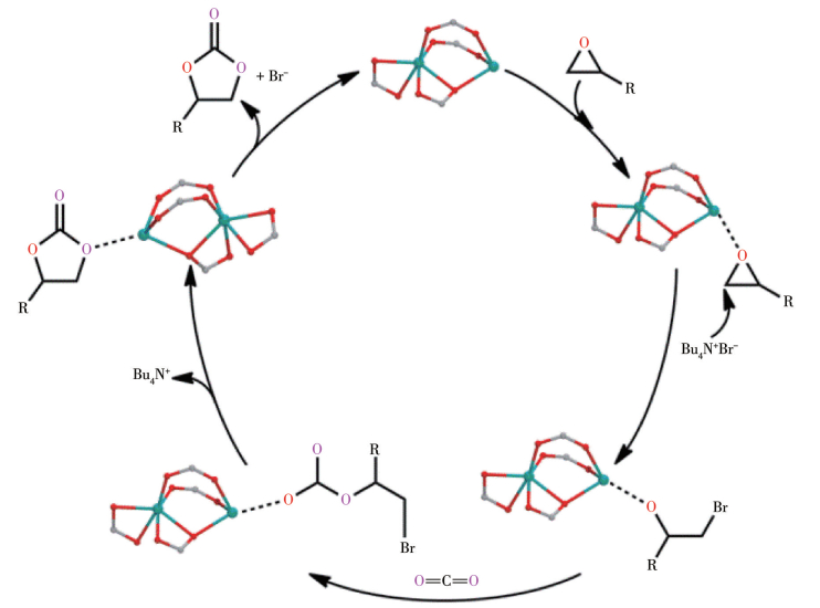 根据晶体结构和实验得到的催化结果,我们推测了Mg-MOF对CO2与环氧化合物环加成反应的催化机理[28-30]。如图 4所示,首先,Mg-MOF中的Mg2+离子作为Lewis酸活性位点与环氧化合物中的O原子形成Mg…O相互作用以激活环氧环,同时CO2被吸附在孔道中。随后,来自TBAB的亲核试剂Br-离子攻击环氧化合物中受空间位阻较小的β-C原子,导致环氧环开环。接下来被吸附的CO2与开环的环氧阴离子反应形成中间体,该中间体通过闭环步骤进一步转化为环状碳酸酯,最后使催化剂再生。