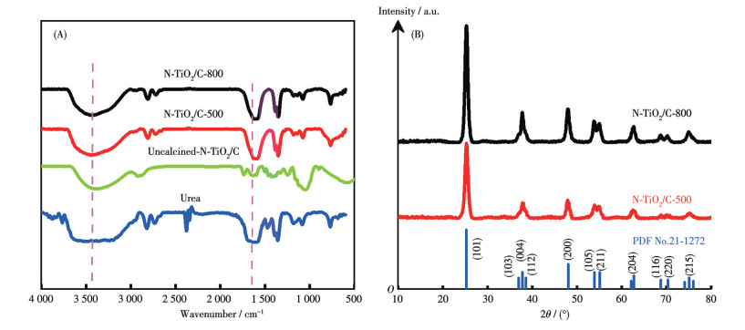 Figure 1. (A) FTIR spectra of the urea, Uncalcined-N-TiO2/C, N-TiO2/C-500 and N-TiO2/C-800; (B) PXRD patterns of N-TiO2/C composites2.1.2 PXRD patterns