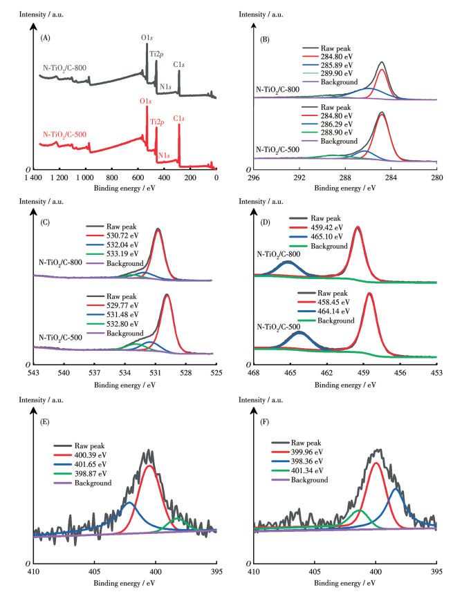 The elemental composition and content of the N-TiO2/C-800 and N-TiO2/C-500 composites were analyzed using XPS. Both composites exhibited an additional N1s peak at 400 eV (Fig.2A), although the peak intensity was relatively weak, suggesting a low N content. As shown in Fig.2B, the high-resolution C1s spectrum of N-TiO2/C-800 revealed diffraction peaks at 284.80, 285.89, and 289.90 eV, which correspond to C—C, C—O, and C=O bonds. The high-resolution C1s spectrum of N-TiO2/C-500 demonstrated three peaks at 284.80, 286.29, and 288.90 eV, corresponding to C—C, C—O, and C=O bonds[37]. The presence of abundant carbon sources from urea and sawdust suggests a high concentration of functional groups in the composites, providing numerous active sites. However, neither sample displayed a peak at 281-282 eV in the C1s spectrum[38], indicating that carbon is not incorporated into the TiO2 lattice. The high-resolution O1s (Fig.2C) spectrum for N-TiO2/C-800 showed diffraction peaks at 530.72, 532.04, and 533.19 eV, corresponding to carbonyl oxygen and oxide components (i.e., Ti—O—Ti), oxygen-containing single bonds (i.e., C—O—H and C—O—C), and chemisorbed oxygen. For N-TiO2/C-500, peaks at 529.77, 531.48, and 532.80 eV are attributed to similar components. The Ti2p spectrum (Fig. 2D) of N-TiO2/C-800 exhibited two peaks, which shifted towards higher binding energies by approximately 0.18 eV compared to the orbital binding energies of TiO2 (Ti2p3/2: 459.42 eV, Ti2p1/2: 465.10 eV). This shift indicates the introduction of impurity energy levels, which reduces the energy level spacing for electron transitions, thereby resulting in a red shift. The binding energies of Ti2p3/2 and Ti2p1/2 orbitals of N-TiO2/C-500 were 458.45 and 464.14 eV, respectively. As shown in Fig.2E and 2F, the N1s peaks of N-TiO2/C-800 appeared at 398.87, 400.39, and 401.65 eV, while for N-TiO2/C-500, they were at 398.36, 399.96, and 401.34 eV. The peaks at 398.87 and 398.36 eV correspond to C—N bond configurations, while the β-N1s electron peak appeared near 400.00 eV, indicating the incorporation of N into the interstitial sites of the TiO2 lattice. Peaks at above 400 eV are attributed to interstitial N species. The Ti, C, N, and O content of N-TiO2/C-800 was 13.49%, 54.18%, 1.06%, 31.26%, respectively, as shown in Fig.2A.