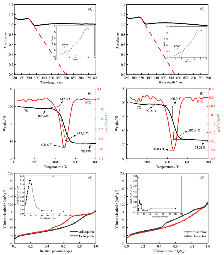 The surface areas, average pore sizes, and pore volumes of N-TiO2/C composites were determined through nitrogen absorption-desorption measurements. Fig.3E and 3F illustrate that both N-TiO2/C-800 and N-TiO2/C-500 showed a type Ⅳ adsorption isotherm with an H3 hysteresis loop at a relative pressure of 0.40, indicating the complex and irregular mesoporous structure. The insets of Fig.3E and 3F reveal that the pore size distribution of N-TiO2/C was primarily concentrated in the 5-15 nm range. As shown in Table 1, the SBET of N-TiO2/C-800 and N-TiO2/C-500 was 157 and 137 m2·g-1, respectively, with corresponding pore sizes of 6.163 9 and 5.566 3 nm, providing substantial evidence for the mesoporous structure in the composites. Consequently, the N-doping of TiO2/C enhances its surface area and pore structure, thereby providing more active sites, which leads to an increased adsorption capacity for pollutant molecules and enhanced photocatalytic activity.