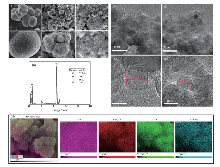 Figure 4. SEM images of (A) N-TiO2/C-800 and (B) N-TiO2/C-500; (C) SEM images of N-TiO2/C composites before calcination; (D, E, F) Partial enlargement of A, B, and C, respectively; (G) EDS spectra of N-TiO2/C-800 and (H) element mapping of C, O, Ti, and N; TEM images of (I) N-TiO2/C-800 and (J) N-TiO2/C-500; (K, L) Partial enlargement of I and J, respectively2.1.8 TEM analysis