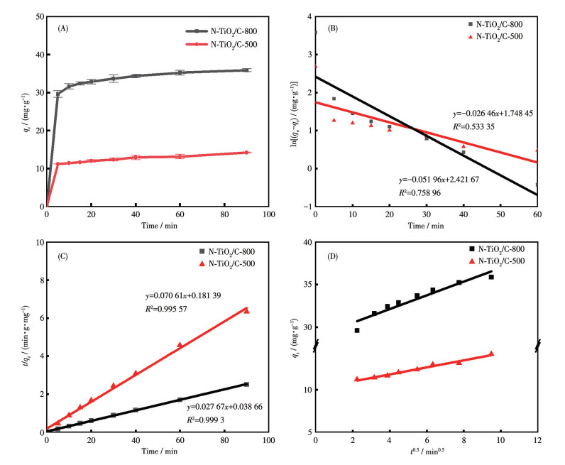 The experimental data were analyzed using a pseudo-first-order kinetic model (Fig.5B). A significant discrepancy was observed between the calculated equilibrium adsorption capacity (qe, cal) and the experimental value (qe, exp). The R2 values for N-TiO2/C-800 or N-TiO2/C-500 were lower than those of the pseudo-second- order kinetic model, indicating that the adsorption process does not adhere to the pseudo-first-order kinetic model.