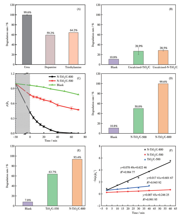 Figure 6 (A) Photocatalytic activities of the composites with different nitrogen sources to MB; (B) Photocatalytic activities of Uncalcined-N-TiO2/C, Uncalcined-TiO2/C, and blank to MB; (C) Plots of ρt/ρ0 vs t and (D) photocatalytic activities for N-TiO2/C-800, N-TiO2/C-500, and blank to MB within 70 min; (E) Photocatalytic activities of N-TiO2/C-800 and TiO2/C-550 composites to MB within 30 min; (F) Linear fitting for pseudo-first-order kinetic models of MB degradation on N-TiO2/C-800, N-TiO2/C-500, and TiO2/C-550