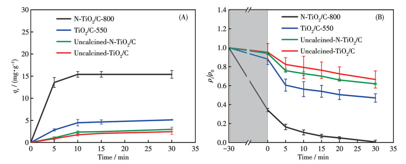 Sample Adsorption capacity / (mg·g-1) Degradation rate / % N-TiO2/C-800 15.4±0.9 99.4±1.8 TiO2/C-550 5.1±0.1 53.0±4.4 Uncalcined-N-TiO2/C 3.0±0.5 38.1±6.4 Uncalcined-TiO2/C 2.4±0.6 33.5±8.9 -