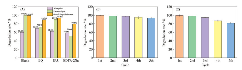 The photocatalytic degradation mechanism of MB (15 mg·L-1, 50 mL) by N-TiO2/C composites was systematically examined by analyzing the active species involved h+, ·O2-, and ·OH, as shown in Fig.8. During the entire catalytic process, BQ, IPA, and Na2EDTA were used as captors for ·O2-, ·OH, and h+, respectively. The adsorption rates during the initial adsorption stage were 69.2%, 62.2%, and 58.8% for each captor, while the degradation rates during the photocatalytic process were 72.0%, 90.5%, and 51.0%, respectively. Under the combined influence of adsorption and photocatalysis, the degradation efficiencies of MB were 89.7%, 93.8%, and 79.5%, respectively. The captors minimally affected adsorption but affected MB degradation. The photocatalytic degradation process was notably inhibited by the addition of Na2EDTA, indicating that h+ is the predominant active species in the degradation of MB. While ·O2- and ·OH contribute to the photocatalytic process, their effects were comparatively minor. The generation of holes facilitates the production of a substantial number of hydroxyl radicals, speeding up the redox reaction and promoting the degradation of organic matter. The stability of the photocatalyst is also a critical factor in evaluating its performance. After five cycles, the degradation efficiency of N-TiO2/C-800 for 20 mg·L-1 MB decreased to 93.2%, while its efficiency for 20 mg·L-1 OTC declined to 81.4%, indicating that N-TiO2/C-800 exhibits excellent stability and reproducibility.