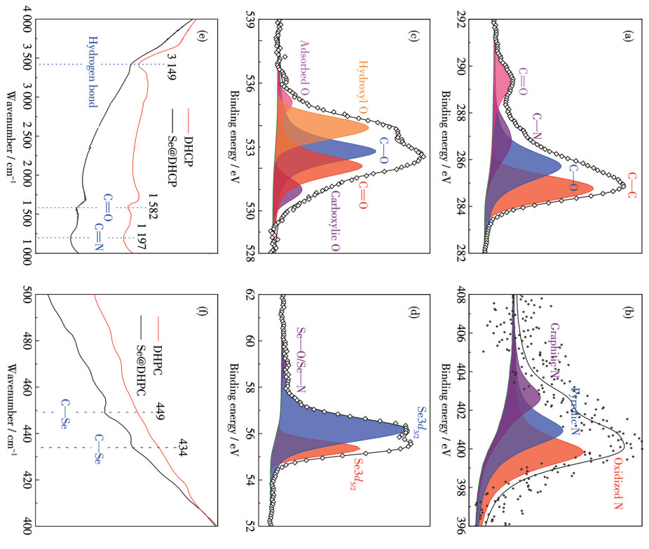 Figure 3.  (a) C1s, (b) N1s, (c) O1s, and (d) Se3d XPS spectra of Se@DHPC; (e, f) FTIR spectra of DHPC and Se@DHPC