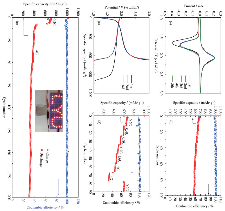 Fig. 4b presents the cycling performance of the Se@ DHPC cathode in Li-Se batteries at 0.2C. At the initial cycle, the high irreversible specific capacity loss (Fig. 4b) was usually met with the irreversible reactions between Li and surface functional groups and the formation of a solid electrolyte interface (SEI) layer by the electrolyte[33]. Besides, Se@DHPC could achieve high initial reversible specific capacities of 675 mAh·g-1. After the first few cycles, Se@DHPC showed a high reversible specific capacity of 578 mAh·g-1 with 84% capacity retention rate after 100 cycles. Thus, the excellent capacity retention of Se@DHPC confirms the cooperative effect of diatomic doping in the porous carbon matrix. The electrochemical characteristics of Se@DHPC are demonstrated in Fig. 4c by galvanostatic discharge/charge evaluation in the voltage range of 1.0-3.0 V at 0.2C (135.6 mA·g-1). The cathode exhibited a ramp voltage platform similar to the CV curve, which further verifies and validates the existence of only a single-phase change electrochemical reaction in the charging/discharging process. As shown in Fig. 4c, the initial specific discharge and charge capacities of Se@DHPC were 1 010 and 676 mAh·g-1, respectively. Due to the irreversible formation of the SEI layer, the irreversible capacity of the first cycle was 334 mAh·g-1 [34-35]. Notably, the gaps between lithiation and delithiation profiles did not significantly alter with the deepening of the cycle, which confirms good electrochemical stability of Se@DHPC composite[32, 36]. The as-prepared Se@ DHPC composite exhibited excellent rate performance, as shown in Fig. 4d. Se@DHPC provided a high reversible specific capacity of 315 mAh·g-1 even at a high current density of 4C (2.72 A·g-1). With the current density returning to 0.2C, the discharge specific capacity reverted to 608 mAh·g-1. Fig. 4e depicts the excellent cycling stability of Se@DHPC in lithium storage. After 200 cycles, the composite provided a stable, reversible specific capacity of 312 mAh·g-1 at 4C with nearly 100% Coulombic efficiency, revealing high rate performance and good cyclic stability. Simultaneously, it showed a very low specific capacity decay rate of only 0.14% per cycle. To demonstrate the practical potential of using visual identification, Se@DHPC based soft-packed Li-Se batteries were assembled, which can easily power a series of light-emitting diodes (LEDs) with "LYU" pattern, as displayed in the insets of Fig. 4e. Compared to Se@DHPC, Fig.S3 demonstrates much inferior electrochemical properties of pure Se and DHPC electrodes. The first reversible discharge specific capacity for DHPC was 91.6 mAh·g-1. After 100 cycles, the reversible specific capacity was only 17.3 mAh·g-1, revealing the negligible capacity contribution from DHPC in Se@DHPC. Compared to the original electrode (Fig.S4a, S4b), the SEM image of the Se@DHPC electrode after cycling (Fig.S4c, S4d) revealed that the morphology remained substantially unchanged after the cycling, indicating the good structural stability of Se@DHPC. Thus, all the above results showed that the prepared Se-loaded DHPC cathode material had superior electrochemical stability and rate characteristics.
