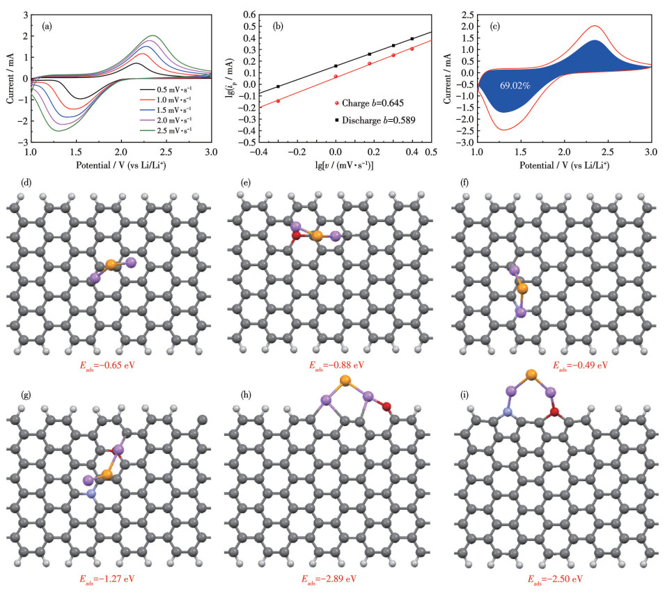 Figure 6  Quantitative kinetics analysis of Se@DHPC for Li-Se batteries and DFT calculation for Na-Se batteries: (a) CV curves at different scan rates; (b) determination of the b-value by the relationship between the scan rate and the peak current; (c) capacitive contribution (the blue section) at 2.5 mV·s-1; (d-i) DTF simulation optimized chemisorption structure of Na2Se on doped and undoped carbon substrates