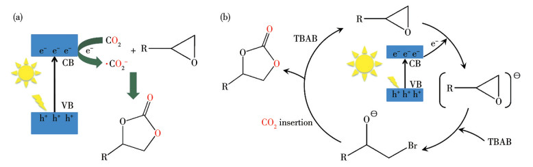 Figure 1. Two mechanism diagrams of the photocatalytic CO2 cycloaddition reaction: (a) radical-anion pathway and (b) epoxide-activation pathway(2) Epoxide-activation pathway: alternatively, a negatively charged intermediate is created when the photoelectrons directly interact with the epoxide. The co-catalyst, most commonly tetrabutylammonium bromide (TBAB), facilitates Br--mediated nucleophilic ring opening, subsequent CO2 insertion, and ring closure to afford cyclic carbonate[11] (Fig. 1b). Other nucleophilic salts, such as tetrabutylammonium iodide (TBAI) or potassium iodide (KI), can also be employed. However, their efficacy may vary depending on the catalytic system[5]. A representative illustration is demonstrated by PB-modified WO3-x, wherein photoexcitation induces electron capture at oxygen vacancy sites. These trapped electrons subsequently interact with epoxy functionalities, generating highly reactive anionic intermediates that undergo successive transformations to yield the desired products[12].
