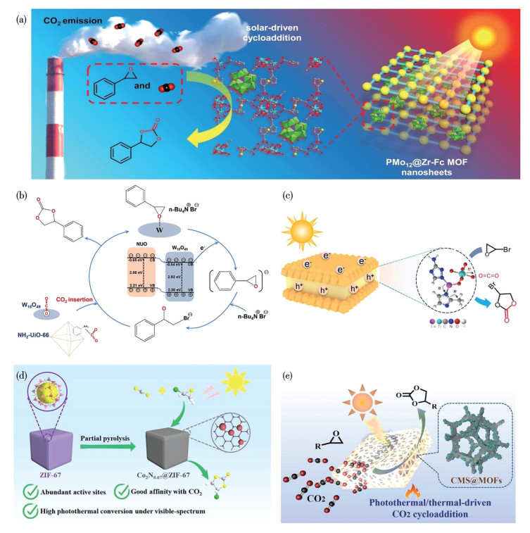 Figure 3 Mechanism diagrams of photocatalytic cyclic carbonates production: (a) PMo12@Zr-Fc (Copyrighted from Ref. [41] with a license), (b) W18O49/-NH2UiO-66 (Copyrighted from Ref. [30] with a license), (c) MIL-125@ZIF-67 (Copyrighted from Ref. [32] with a license), (d) Co2N0.67@ZIF-67 (Copyrighted from Ref. [33] with a license), and (e) CMS@MOFs (Copyrighted from Ref. [35] with a license)