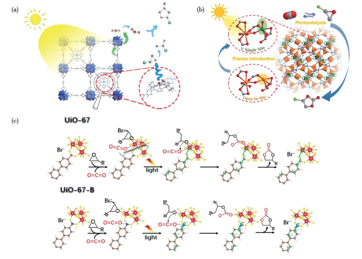 Catalyst Light source Time /h Reaction substrate Conversion /% Yield /(mmol·g-1·h-1) Regulatory strategy Ref. Fe-FcDC 300 W xenon lamp 4 Epichlorohydrin 7 44 Ligand engineering [10] Co-PMOF 3 300 W xenon lamp 6 Epichlorohydrin > 99 61 Ligand engineering [17] MOF-997 300 W xenon lamp 24 Styrene oxide > 99 2 Ligand engineering [18] Th-IHEP-5 45 W fluorescent light 48 Styrene oxide 71 0.6 Ligand engineering [19] Zr-TTF-L1 300 W xenon lamp 8 Propylene oxide 45 14 Ligand engineering [20] MOF 1 (Mn) LED 18×3W 24 Epichlorohydrin 100 17 Ligand engineering [21] Fe-DBP(Co) 1000 W xenon lamp 12 Epichlorohydrin 97 103 Ligand engineering [22] FeTPyP 300 W xenon lamp 5 Styrene oxide 30 106 Ligand engineering [23] Bi-HHTP 300 W xenon lamp 4 Styrene oxide 34 112 Ligand engineering [24] Mg-MOF-74 400 mW·cm-2 12 1-Bromo-2,3-epoxypropane 97 5 Ligand engineering [25] UAEU-50 400 W halogen lamp 24 Styrene oxide 90 6 Ligand engineering [26] Co-HOF 400 W halogen lamp 24 Styrene oxide > 99 6 Ligand engineering [27] NH2-MIL-68 300 W xenon lamp 12 Styrene oxide 94 56 Ligand engineering [28] Ti-H2TPDC 8 W LED light 4 Epichlorohydrin 94 59 Ligand engineering [29] PB-modified WO3-x 300 W xenon lamp 8 Styrene oxide 94 171 Composite construction [12] W18O49/NH2-UiO-66 300 W xenon lamp 4 Styrene oxide 82 58 Composite construction [30] FeNbO4/NH2-MIL-125(Ti) 500 W halogen lamp 72 Propylene oxide 52 0.2 Composite construction [31] MIL-125@ZIF-67 3 W blue LED 36 1-Bromo-2,3-epoxypropane 99 0.3 Composite construction [32] Co2N0.67@ZIF-67 350 mW·cm-2 3 Epichlorohydrin 95 3 Composite construction [33] Zn20Fe1-ZIF/MXene 350 mW·cm-2 6 Epichlorohydrin 96 16 Composite construction [34] CMS@MIL-88-NH2 300 W xenon lamp 6 1, 2-Epoxybutane 72 24 Composite construction [35] Zn SA-NC 300 mW·cm-2 16 Epichlorohydrin 99 0.5 Composite construction [36] CoNHPC/TM-8 350 mW·cm-2 12 Styrene oxide 99 8 Composite construction [37] CuS@HKUST-1 Blue light 18 2-Chloromethyl-oxriane 98 11 Composite construction [38] Ag0.1/NWU-Cd3a 300 W xenon lamp 6 Styrene oxide 94 22 Composite construction [39] Zn-N-HOPCPs 350 mW·cm-2 10 Propylene oxide 95 29 Composite construction [40] PMo12@Zr-Fc 500 mW·cm-2 8 Epichlorohydrin 96 298 Composite construction [41] UiO-67-B 300 W xenon lamp 6 Propylene epoxide 6 45 Dopant incorporation [42] Bi-PCN-224 300 W xenon lamp 6 Propylene epoxide 99 5 Dopant incorporation [43] Tb-DBP(Co) 300 W xenon lamp 10 Epichlorohydrin > 99 127 Dopant incorporation [44] SNNU-97-InV 300 W xenon lamp 24 2-Bromooxirane 97 14 Dopant incorporation [45] Zn-UiO-bpydc 300 W xenon lamp 9 Propylene oxide 75 0.3 Dopant incorporation [46] IHEP-9 45 W compact fluorescent lamp 12 Styrene oxide 99 2 Dopant incorporation [47] 2.1 Ligand engineering