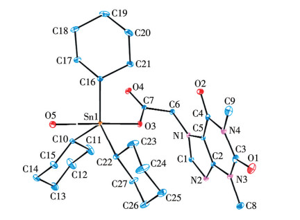 Organotin complexes have attracted considerable attention due to their versatile structures, rich reactivity, notable biological activity, and broad applications[1-8]. Notably, their inhibitory effects on cancer cell proliferation have opened new avenues for developing broad-spectrum and efficient antitumor drugs[9-15]. The structural, reactive, and biological properties of organotin complexes are influenced not only by the hydrocarbyl groups directly bonded to the tin atom but also by properties of the ligands. Functionalized ligands can significantly alter the coordination mode of tin atoms, thereby modulating the balance between toxicity and biological activity[16-22]. Especially when substituted carboxylic acids or heterocyclic carboxylic acids containing active groups as substituents are used as ligands, they are more likely to form organic tin complexes with distinct structural features and unique properties[23-28]. Theophylline-7-acetic acid is a prime example of this type of ligand.